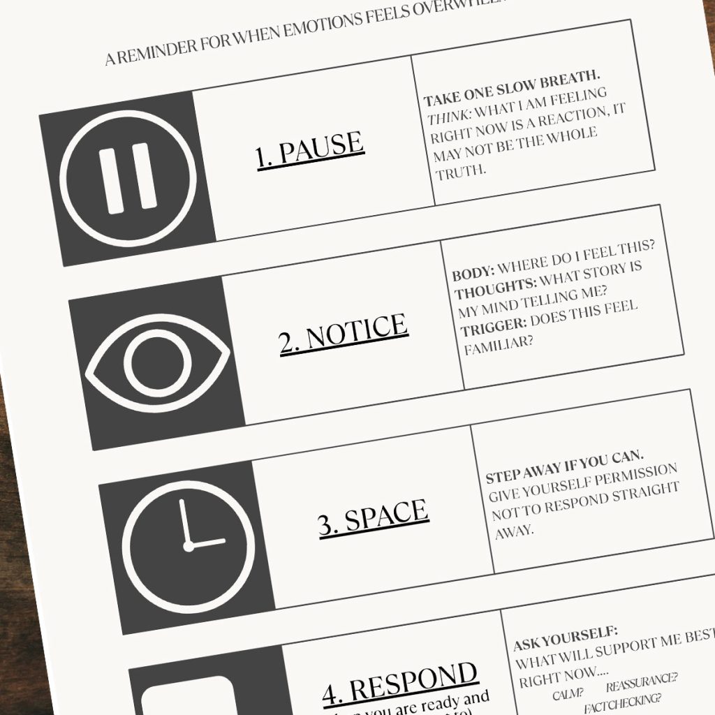 The Pause and Reset Toolkit is a simple, five-step guide designed to help you regain control when emotions feel overwhelming. It begins with the crucial first step of PAUSING: taking a single slow breath to remind yourself that the intense feeling is a reaction, which may not be the entire truth. This is immediately followed by NOTICING, a gentle process of self-enquiry where you identify where the feeling resides in your body, what story your mind is telling you, and if the trigger feels familiar. The third step is to create SPACE by stepping away, giving yourself permission not to react immediately.